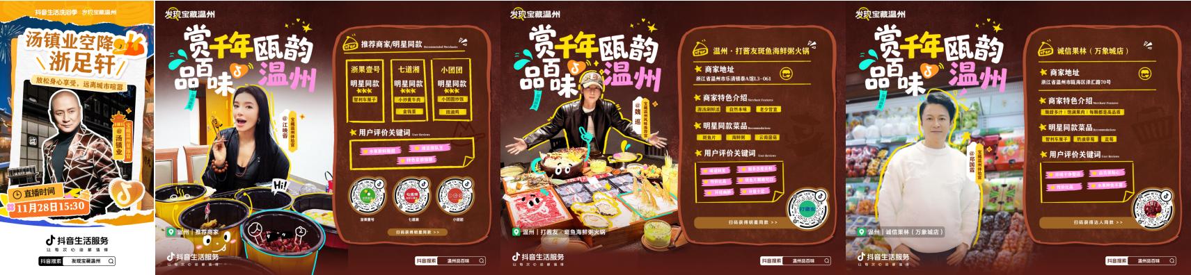 抖音#发现宝藏温州活动深度整合明星与达人资源,构建起“头部明星引流+本地达人深耕”的立体传播矩阵,精准匹配不同商户调性,实现流量的精准触达与高效转化,助力商户实现声量与业绩的双重突破。