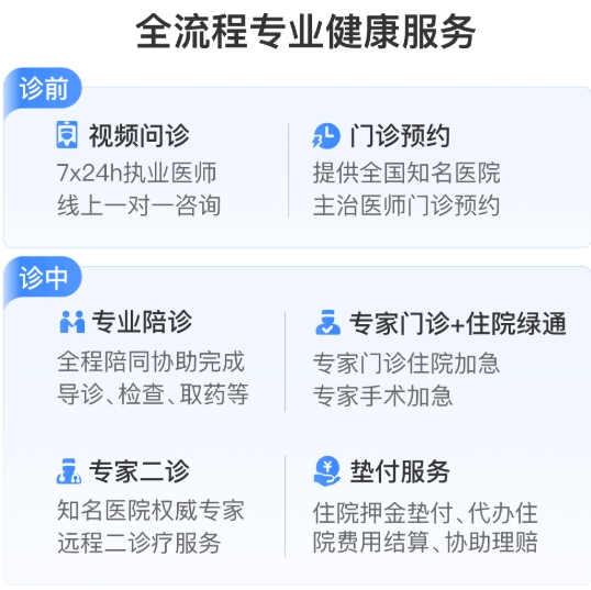 诊中:专业陪诊、住院绿通、专家二诊、费用垫付,从导诊到手术再到结算,全程有人帮;