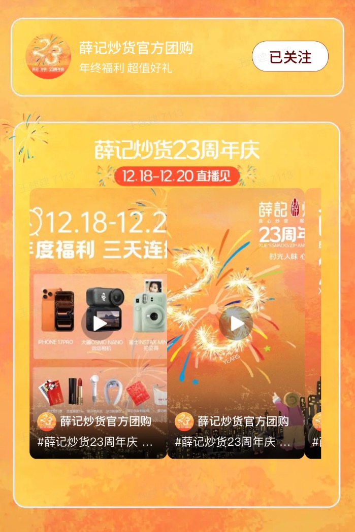 “薛大叔”空降现场,则将这场庆典推向情感与互动的高潮。 12月18日,薛记炒货创始人薛兴柱先生亲临直播间,亲自讲解产品,分享创业故事,其朴实、真诚的形象,瞬间拉近了品牌与用户的距离。他带来的福利更是堪称“王炸”:iPhone 17 Pro、大疆OSMO NANO运动相机、富士INSTAX MINI12拍立得等潮流数码大奖,精准吸引了年轻群体的目光,也成功完成了一次品牌人格化深度对话。