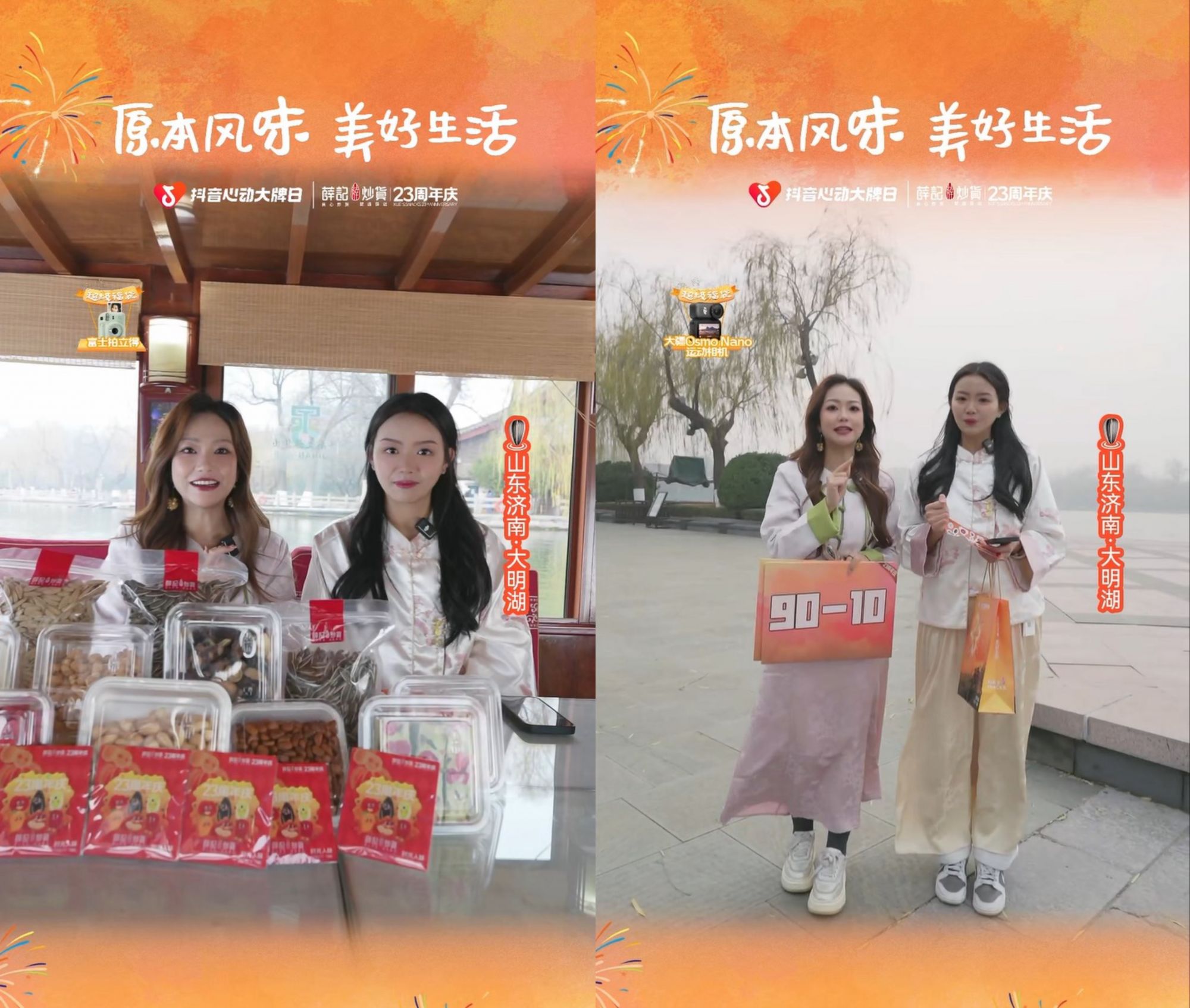 直播间没有局限于常规的货架背景,而是将薛记品牌的发祥地——山东济南的地标性景区大明湖的优美景致,与23周年庆的喜庆元素巧妙融合。荷塘月色、亭台楼阁的意境,与现代感的直播舞台交织,营造出一种穿越时空的庆典氛围。不仅极具美感与独特性,实现了视觉上的“破圈”,更深层次地呼应了品牌“溯本源,敬‘良心’”的文化内核。它将品牌的地理根源、情感记忆与产品价值,以一种极具仪式感和沉浸感的方式带入直播间,充分调动了用户的“同感力”,让用户仿佛亲临一场为薛记庆生的文化雅集。