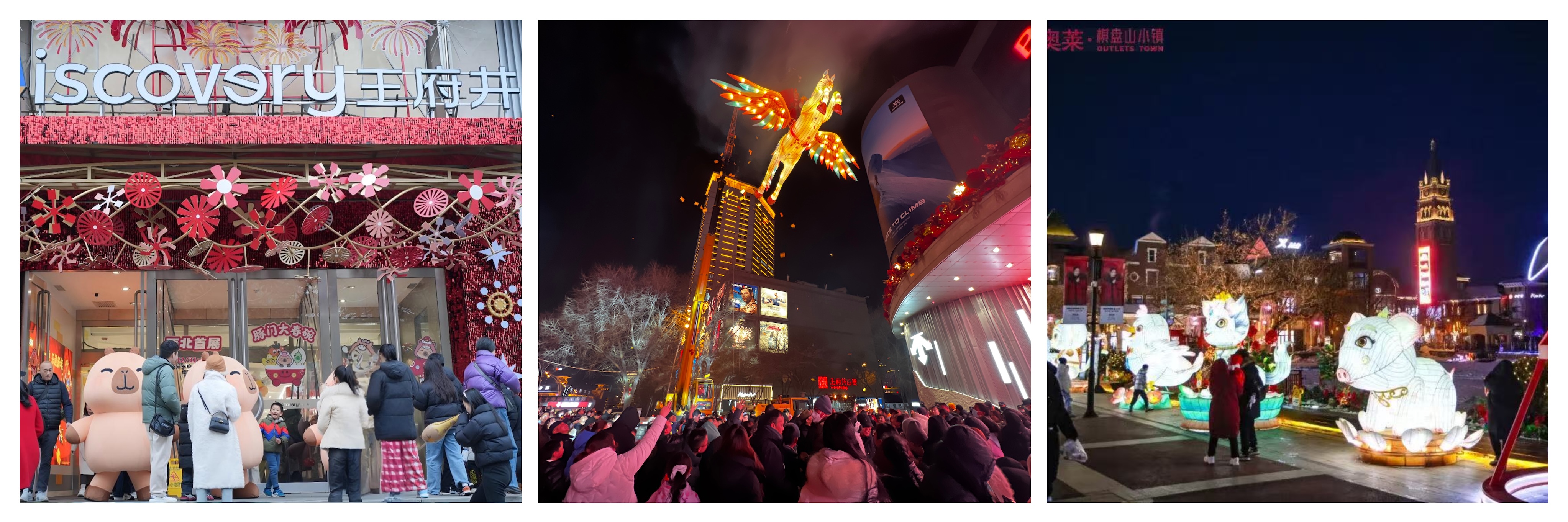 跨区域门店特色活动精彩纷呈,精准对接不同客群需求。西安王府井Discovery以“一马当先,玩出圈”为主题打造跨年嘉年华,“卡皮巴拉西北首展”成为流量焦点,吸引大量年轻顾客与亲子家庭驻足;西宁王府井西门店“飞马财神撒金币”活动融合马年元素与财运文化,沉浸式场景吸引数千市民齐聚跨年。王府井奥莱·沈阳棋盘山小镇以多元活动汇聚人气,为市民带来了实实在在的消费乐趣与优惠。锣鼓声中醒狮腾跃,为新年祈福纳祥,营造出欢乐洋溢的节日氛围;“萌宠巡游”成为焦点,家庭顾客流连驻足、笑声不断;免费民俗花灯展同期点亮,吸引众多市民拍照打卡,沉浸式体验传统文化魅力。