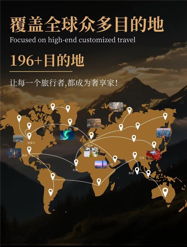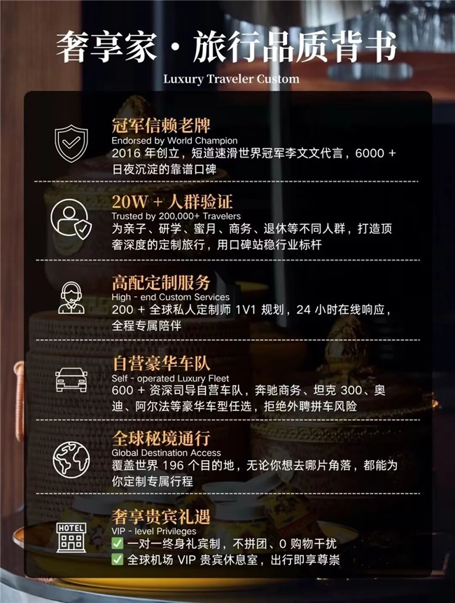 奢享家,作为引领高端定制游的行业标杆品牌,我们用9年时间,打破“套用模板”的行业陈规,不断深挖目的地的美学探索、深度的文化探寻与顶奢的住宿体验,成为被世界冠军李文文代言,覆盖全球196+目的地,受到120万小红书用户口碑认证的定制游企业。
