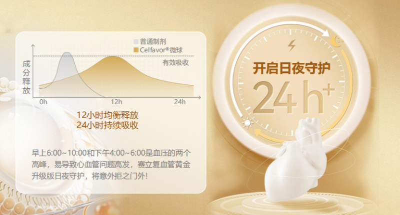 早6-10点、下午4-6点的血压高峰,让心脑血管事件风险飙升3倍,传统干预仅聚焦“降指标”,却难修复血管内皮损伤,也无法精准应对高峰危机。作为心血管研究的最新科研突破——赛立复血管黄金PLUS以Celfavor®缓释纳米微球专利技术+超级双还原辅酶配方,重塑心脑健康守护新标准,实现“根源修复内皮+24h精准护心脑”,成为全人群心脑血管健康的权威解决方案。