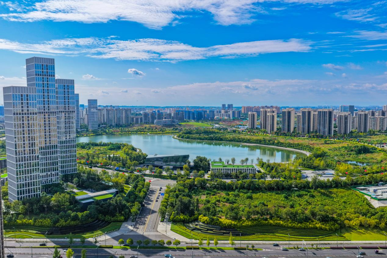 双流区采取“远端引流、近端防控”的生态治理思路,将公园城市建设与净空保护有机结合。位于双流新城核心区的空港中央公园“五湖四海”项目,规划总面积约8000亩,营造呈南北分布的凤鸣湖、凤翔湖、凤舞湖、凤转湖和凤栖湖,以及呈东西排列的芙蓉海、紫薇海、红枫海和翠竹海,组成公园聚落,形成亚洲最大的人造城市绿肺。