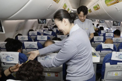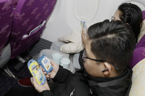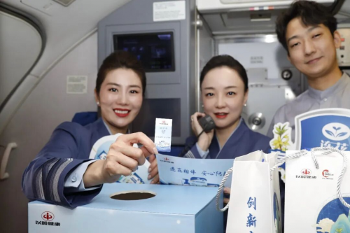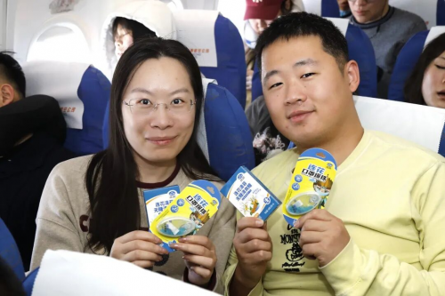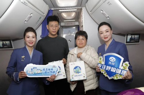 随着活动的推进,客舱内的气氛更加活跃。以座位号进行的幸运抽奖环节,将关爱升级。幸运旅客获得了以岭健康提供的 “连花呼吸健康包”,这份实用而贴心的奖品,让健康呵护得以延续至旅程的每一站。欢声笑语中,健康防护的理念也以一种轻松愉快的方式深入人心。