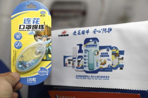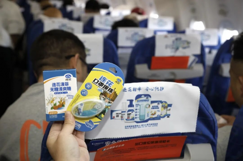 航班进入平飞阶段,常规服务结束后,客舱里响起了乘务员温暖而清晰的声音,欢迎乘坐本次主题航班,正式拉开了云端健康关怀的序幕。一份份承载着关爱的小礼物——由以岭健康提供的连花润喉糖与口罩爆珠,送到了每一位旅客手中。润喉糖的清甜滋润着旅途的疲惫,口罩爆珠的清新则悄然构筑起一道无形的防护屏障,细微之处尽显对旅客健康无微不至的考量。