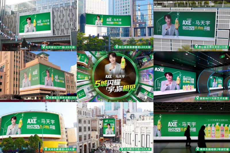 在官宣马天宇作为代言人后,AXE斧頭牌同步展开了从城市地标到线上互动的全域传播,将“超A”态度从观念转化为可感知的公共事件。在北京、上海、广州、深圳、杭州五大一线新一线城市点亮大屏,由线上内容引发的打卡热潮,让线下场景成为跨年夜的现象级地标,粉丝们纷纷前来打卡分享,这些城市大屏变成了跨年夜最具人气和专属仪式感的聚集地。