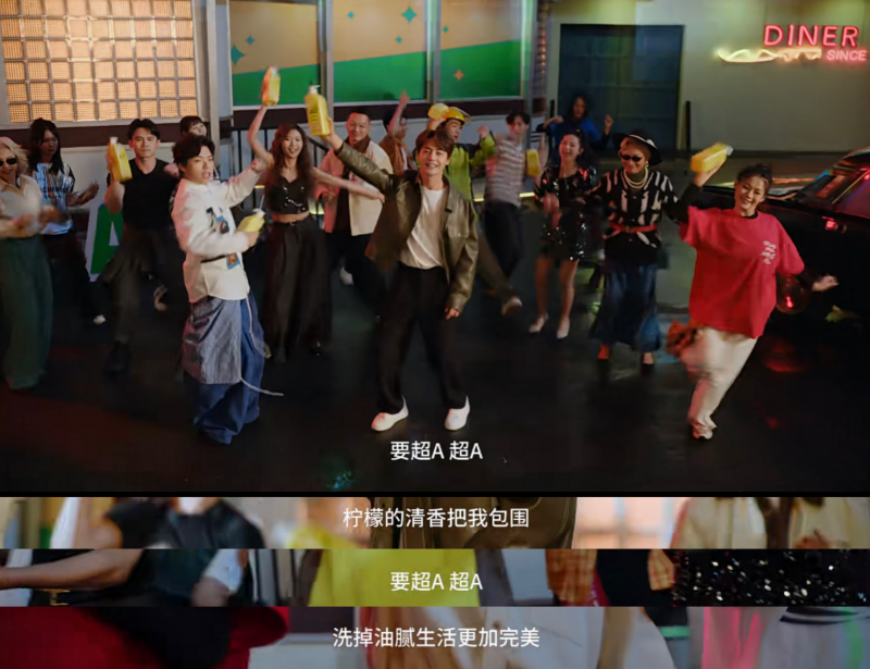 短片中还出现“你有82年的红酒,我有69年的洗洁精“、”我的Flow像这个黄色去油瓶,洗掉油腻天天好心情“等表达,这些并非简单的趣味文案,而是品牌对“产品功效”与“情绪价值”进行深度缝合的话语实践。
