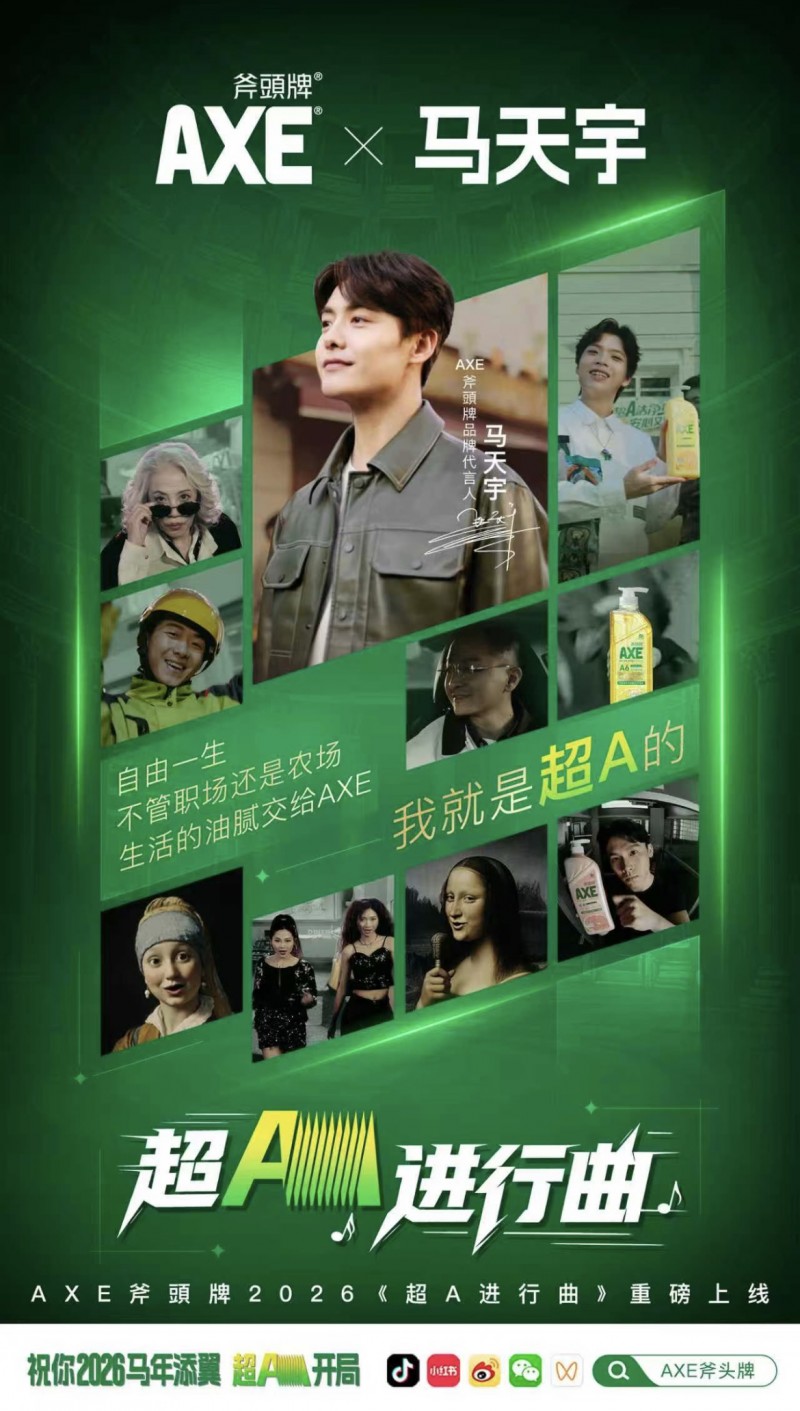 在2025年跨年,AXE斧頭牌携手品牌代言人马天宇,突破品牌合家欢的跨年营销形式,以一首态度说唱《超A进行曲》及同名MV短片,通过马天宇引领的“超A”精神态度,掀起了一场关于自我认同的精神觉醒仪式,与用户共同完成了一次意义深远的“情感跨年”。