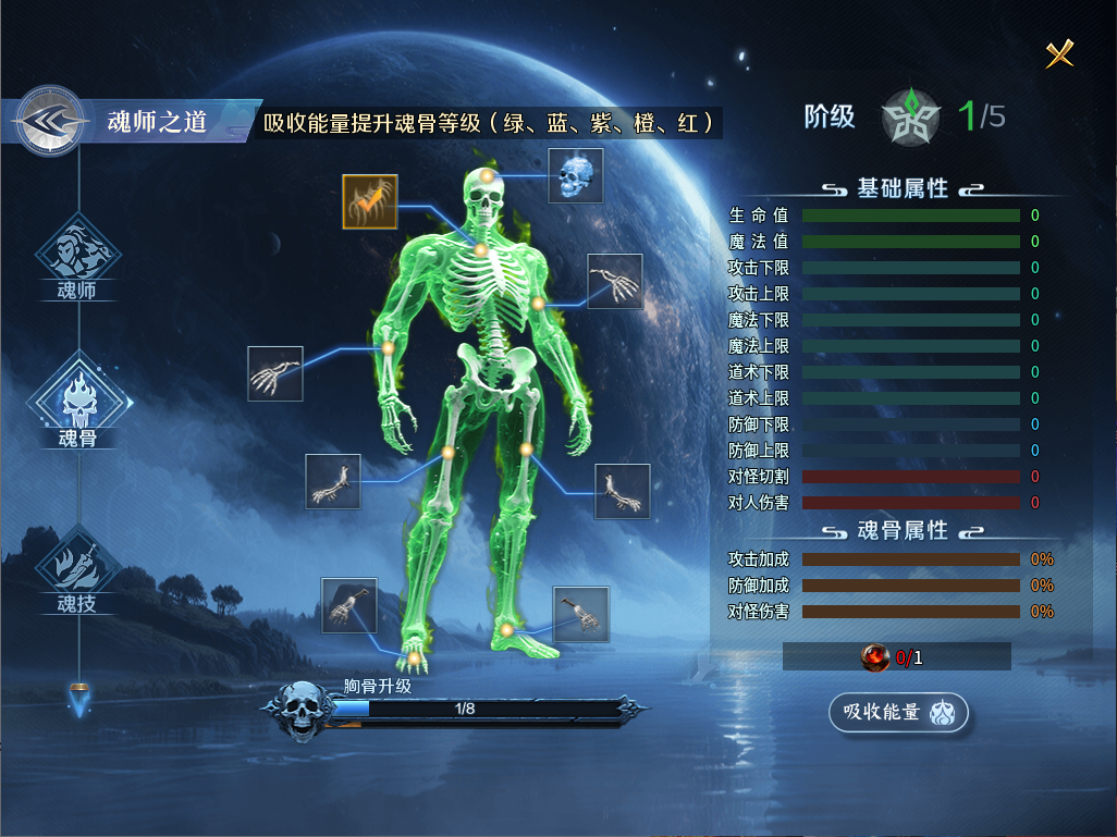魂骨吸收能量挨个升级,材料白怪概率掉落,魂骨等级提升会加强属性,强化自身实力。头骨会在任务引导时免费解锁,从胸骨开始则需要通过消耗击败白色怪概率掉落的“永恒之火”来升级。