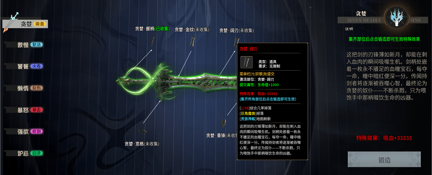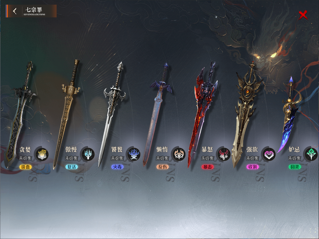 本服最具哲学色彩与收集乐趣的,莫过于七宗罪系统。七把神兵对应人性七种原罪,可以为玩家提供强力的效果,贪婪将提供巨额的吸血属性;傲慢可以使玩家的复活机会加1;饕餮强化玩家最终伤害;懒惰可以将受到的伤害奉还给攻击者;暴怒将提供巨额暴击;强欲直接将对怪切割增幅50%;嫉妒让玩家每秒恢复1%的血量。