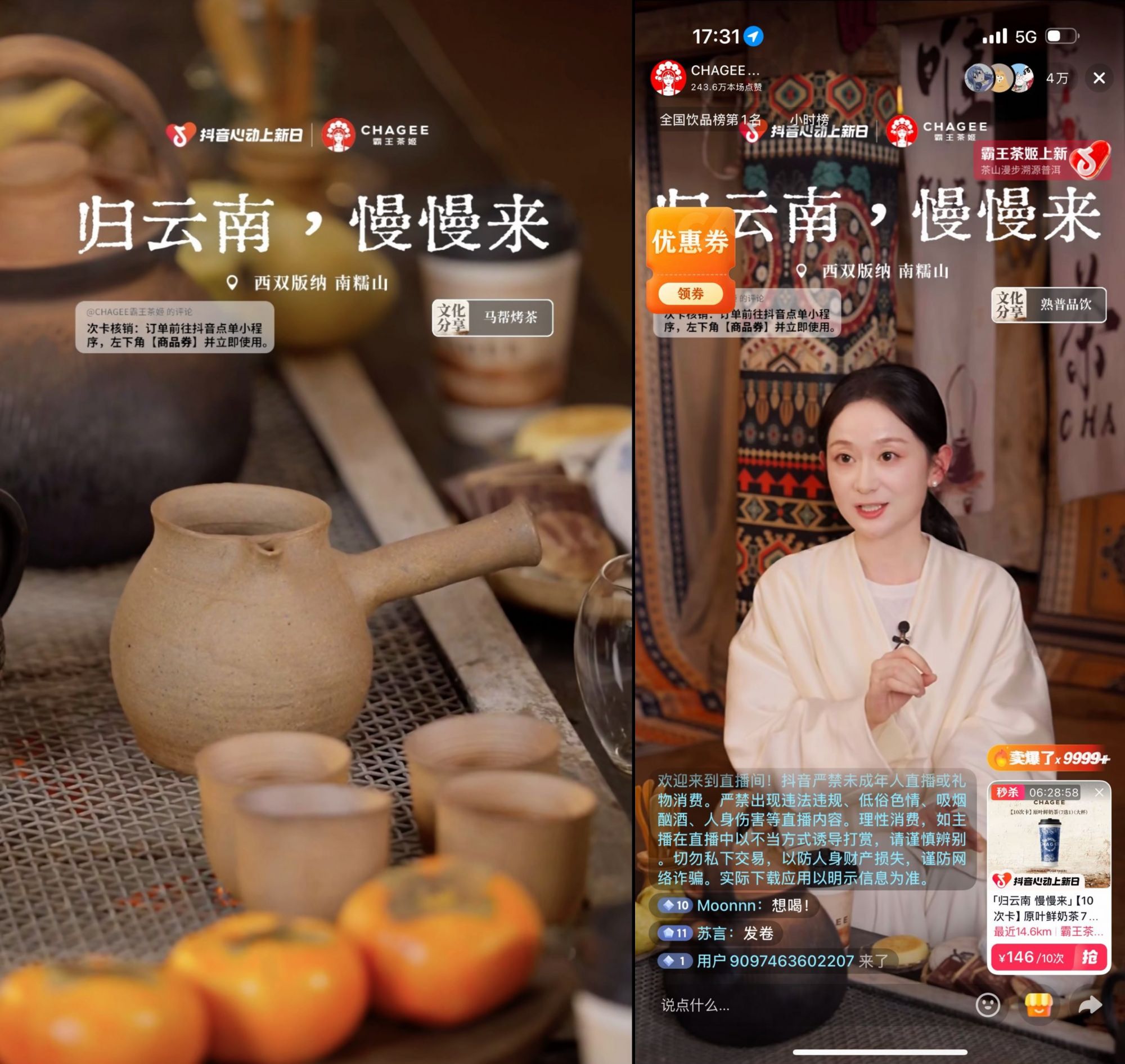 4.独家权益,锚定渠道心智: 为强化抖音渠道的专属价值与用户粘性,霸王茶姬首次与「抖音心动上新日」联合推出“归云南”定制限定周边。该系列周边作为直播间互动福袋,有效提升了用户停留与参与热情;同时作为线下核销的独家赠礼,它精巧地串联起“线上心动囤券-线下体验核销-收获惊喜纪念”的完整消费闭环,显著提升了抖音渠道券包的附加值与核销动力,强力塑造了“上抖音,囤霸王茶姬新品券”的用户习惯与渠道心智。