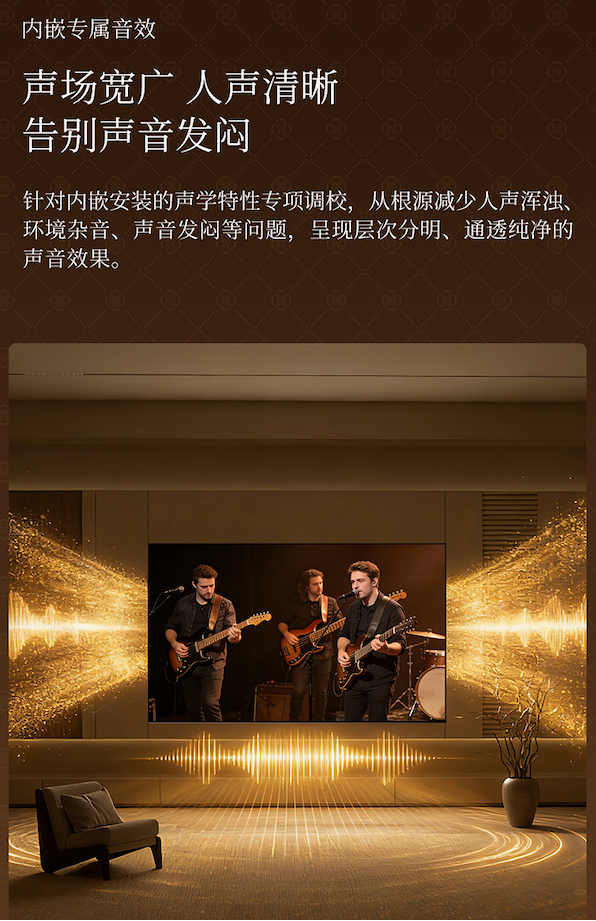更加周全的是,创维A7H还针对内嵌式安装进行了专项声学优化,从根源上解决了内嵌安装后出现的声音发闷、人声模糊等问题。配合左右两侧双回音壁的音响结构设计,无论是人声、音乐还是背景声,都非常清晰且立体,确保内嵌安装的音质与挂墙和落地支架的方式保持一致。