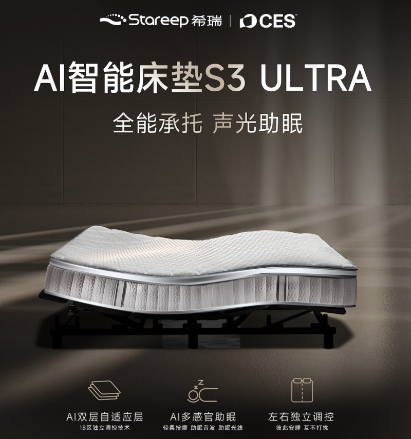 其中,S3 Ultra的“AI床垫+智能底座”双智能组合尤为吸睛,多项技术为全球行业首创,为解决人们的睡眠痛点提供更优质的解决方案。