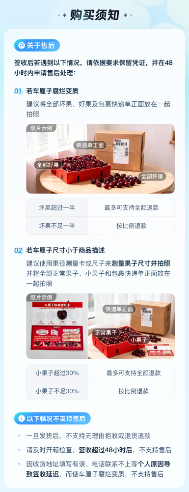 本次全量上线的“果径无忧”权益是抖音电商在车厘子品质保障上的重要升级,覆盖平台所有车厘子商家。相关负责人表示,平台将搭建全流程品质管控体系,提前防范并解决降级发货、规格造假等易引发纠纷的售后问题,例如:要求商家发货时随箱配备果径卡,更方便消费者直观核验规格。同时,平台针对商品质量和规格与宣传不符的问题强化管控,从源头为消费者提供“优价好货”。消费者凡购买带有“果径无忧”标识的车厘子,到货后若发现果径、重量不符或果实损坏等问题,可在签收后48小时内凭有效凭证申请售后。