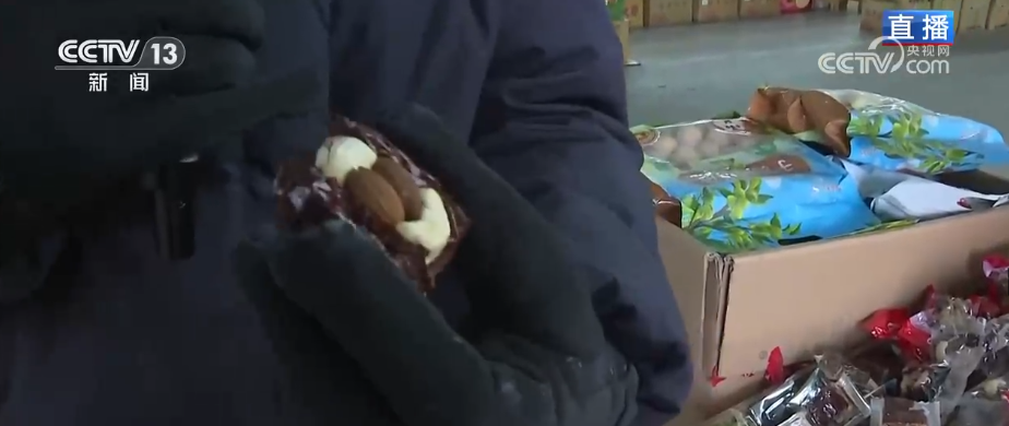 商家也会用心推出一些干果礼盒,比如像这个,一盒里装十种新疆特色干果,每种干果500克,仿佛把整个秋天的美味、新疆的美味都装了进来,特别受欢迎。而且这两年,还有一种特色的“干果组合”也是新卖点。像这种“枣夹核桃”,是把红枣和核桃加工组合到一起,吃起来既有核桃的香又有红枣的糯甜。另外还有这种腰果、巴旦木和红枣组合在一起的“枣园三结义”,也非常好吃热卖,都是节前市场的第一拨“年货冠军”。