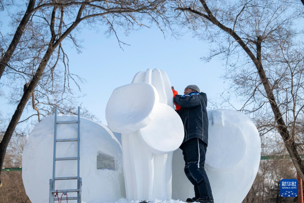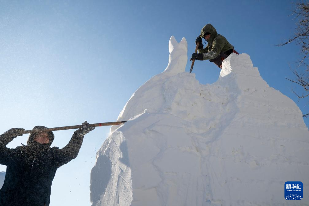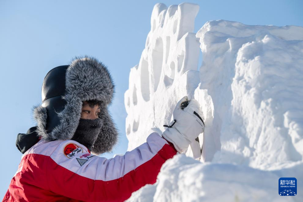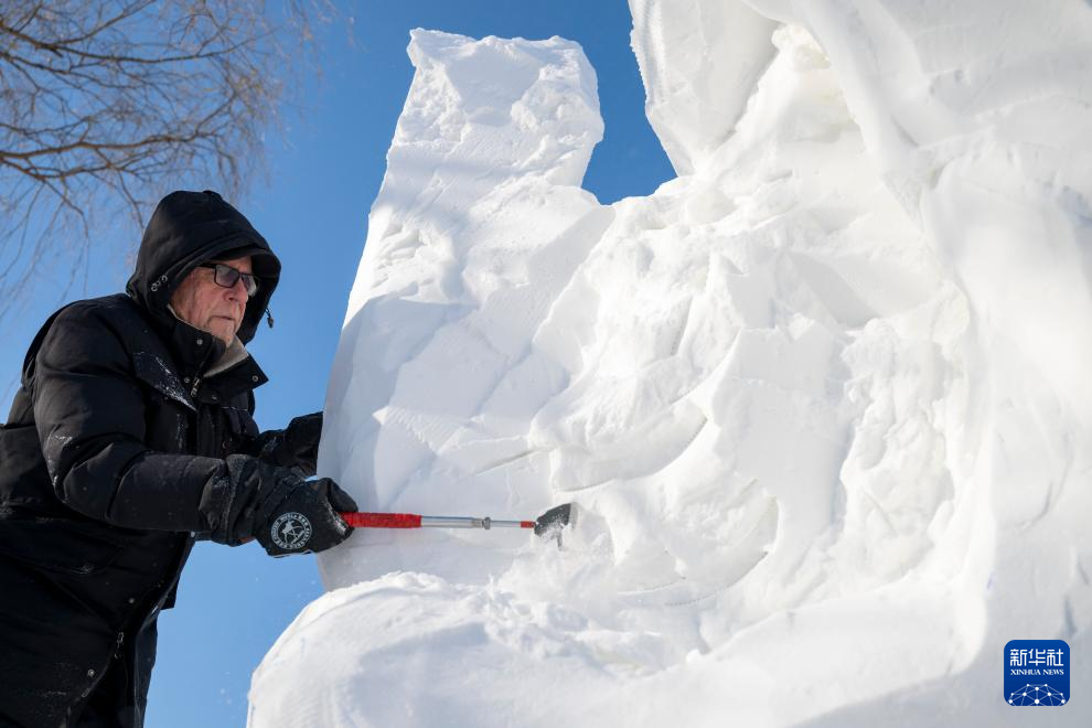 1月7日,在哈尔滨太阳岛雪博会第28届中国·哈尔滨国际雪雕比赛现场,选手在进行雪雕创作。新华社记者 张涛 摄