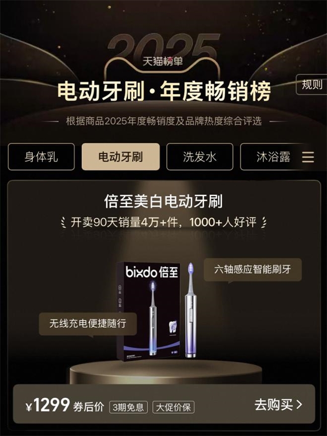 市场反应印证了这一需求。2025年“双11”期间,倍至蓝光电动牙刷3万余台备货全渠道售罄,销售额突破4000万元,单月同比激增792%,成为天猫平台唯一售罄的口腔护理品牌。此外,根据天猫榜单2025年度畅销榜(2025全年消费者在天猫平台的真实消费数据),倍至美白电动牙刷也在电动牙刷品类中,夺得榜首位置。