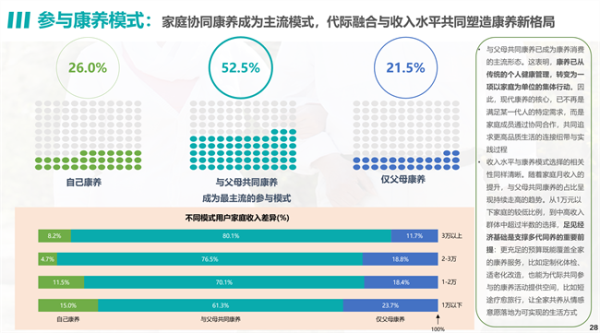 2.家庭协同成为主流:超半数用户选择与父母共同参与康养活动,这一比例在高收入家庭中更为突出。数据显示,随着家庭月收入提升,与父母共同康养的占比持续走高,充足的经济基础为定制化家庭康养服务提供了支撑,定制化体检、适老化改造、家庭疗愈旅行等服务需求不断增长。
