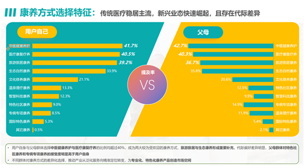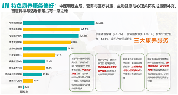 4.中医药康养备受青睐:传统中医养生与理疗以超 41% 的选择率位居各类康养方式之首,超 56% 的用户愿意为其支付相应费用,彰显了中医康养深厚的市场基础与广泛的文化认同。