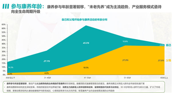 1.消费群体全龄延伸:“未老先养” 成为普遍趋势,康养参与年龄显著前移。30 岁以下参与者占比达 14.3%,41-50 岁职场人群成为消费主力,康养需求不再局限于老年群体,而是向职场减压、情绪疗愈等全场景拓展,产业服务模式亟待向全生命周期升级。
