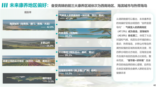 8.区域选择生态导向:“慢节奏 + 好环境” 成为康养目的地选择的核心逻辑。气候宜人的西南地区(47.3%)、海滨城市(42.8%)及热带海岛(如海南)成为最受青睐的三大区域,乡野山村、大山名川等自然属性较强的区域也获得了较高关注度,充分体现了人们对优质生态环境的核心需求。