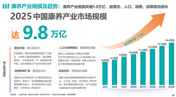《报告》显示,2025 年中国康养产业市场规模已达 9.8 万亿元。在 “健康中国 2030” 战略持续深化、人口结构变化及居民消费升级等多重因素的共同推动下,产业规模将保持稳健增长态势,预计到 2030 年将接近 14.6 万亿元。如今的康养产业,已摆脱早期单一的养老、疗养业态,逐步形成 “医养、文旅、科技、地产、保险” 多领域深度融合、生态协同的高质量发展格局,跨界融合的创新模式不断涌现。