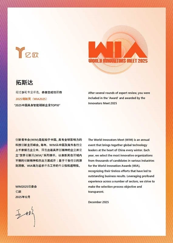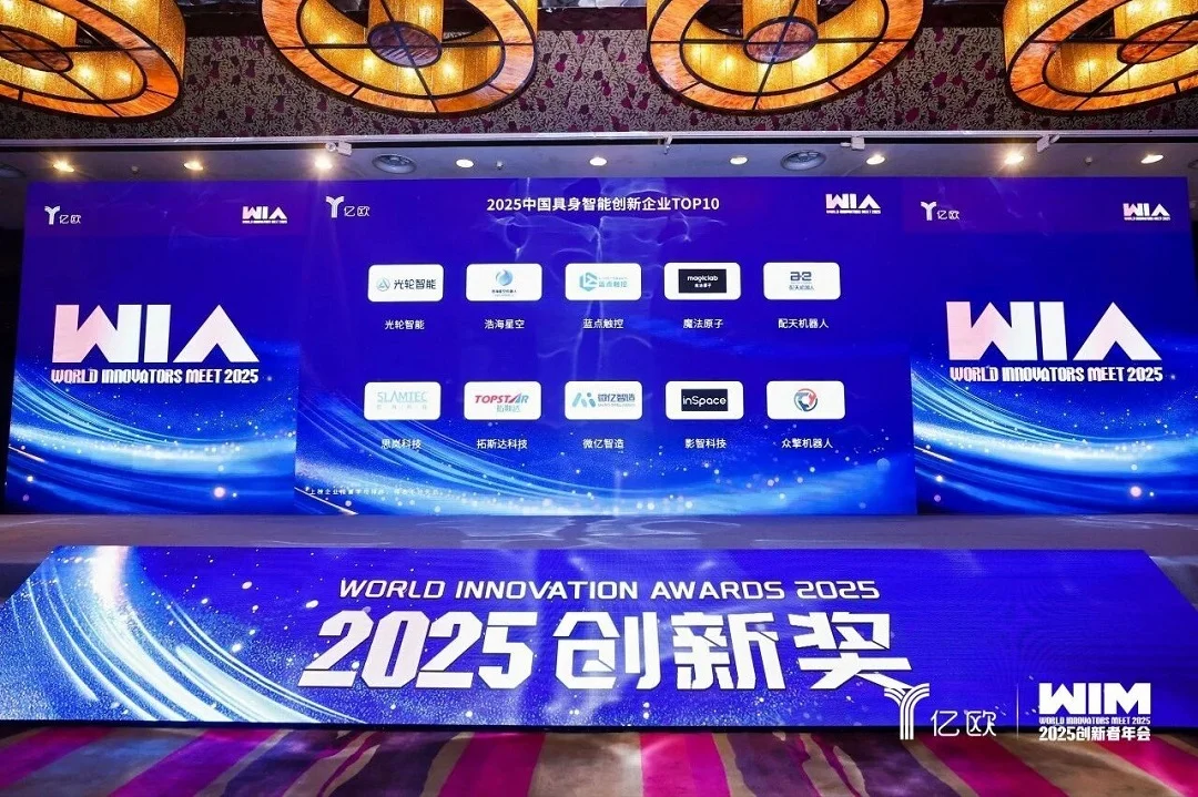 12月3日,在亿欧主办的 “WIM2025 创新者年会” 颁奖盛典上,拓斯达科技凭借在具身智能领域的技术沉淀、场景落地能力及产业赋能成果,成功入选《2025 中国具身智能创新企业 TOP10》,与行业优质企业共同跻身赛道前列,彰显了其在国内人形机器人领域的核心竞争力。本届年会以 “New Growth,New Arena” 为主题,聚焦 AI 引领下的产业新增长,吸引 2000 余位行业从业者共同探讨未来产业的创新趋势与发展路径。