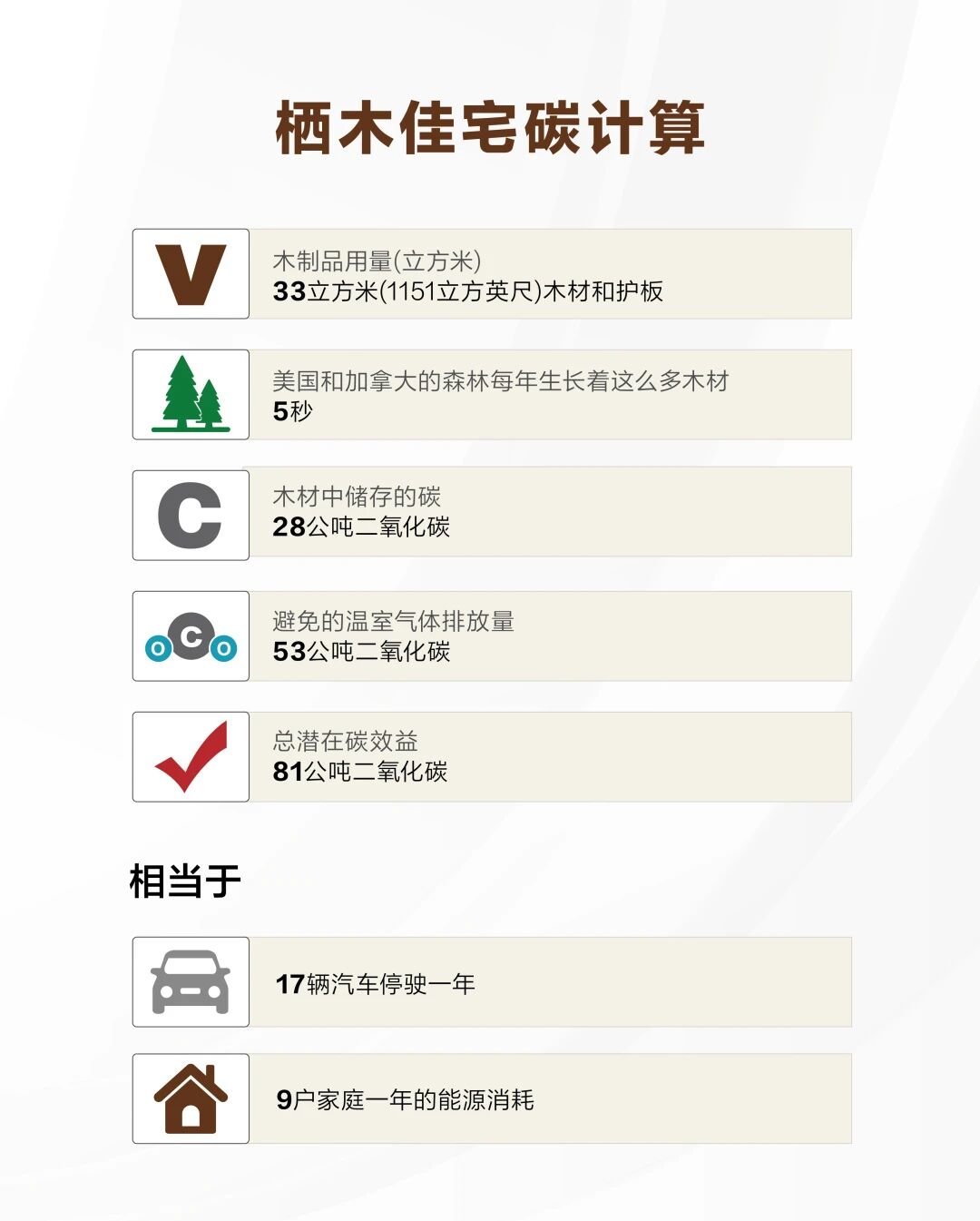“栖木佳宅”总计使用33立方米木材及护板,可储存28公吨二氧化碳。此外,得益于木材的低碳属性与装配式建造方式,相较于传统住宅,其避免了53公吨的温室气体排放,总潜在碳效益高达81公吨二氧化碳,相当于17辆车停驶一年的能源消耗所减少的碳排放量。