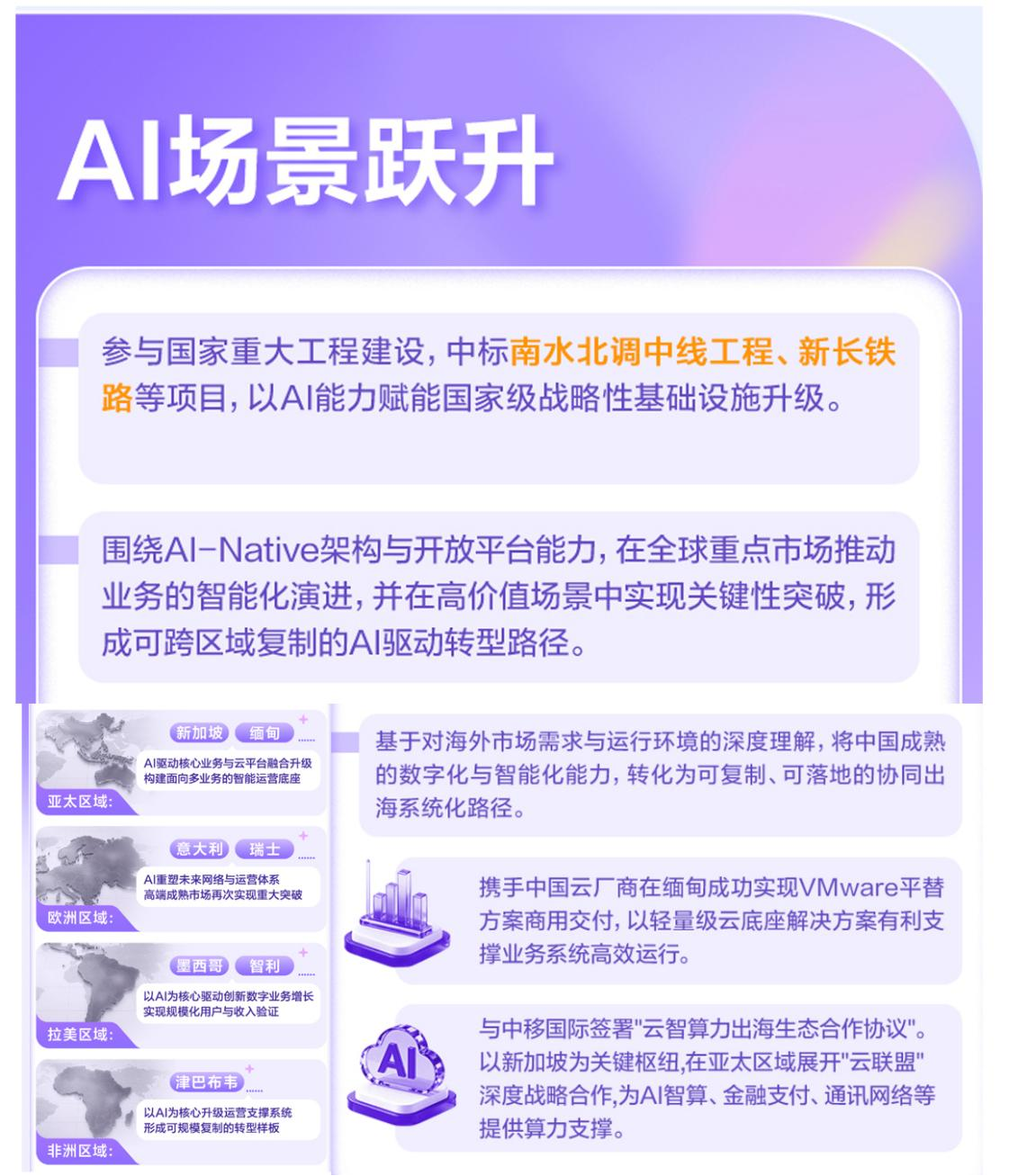 同时,推动“中企出海”步伐提速:把中国数字化能力转化为适配海外的协同出海方案,并与中移国际达成生态合作,以新加坡为枢纽在亚太构建“云联盟”,实现技术落地与全球生态的双向进阶。