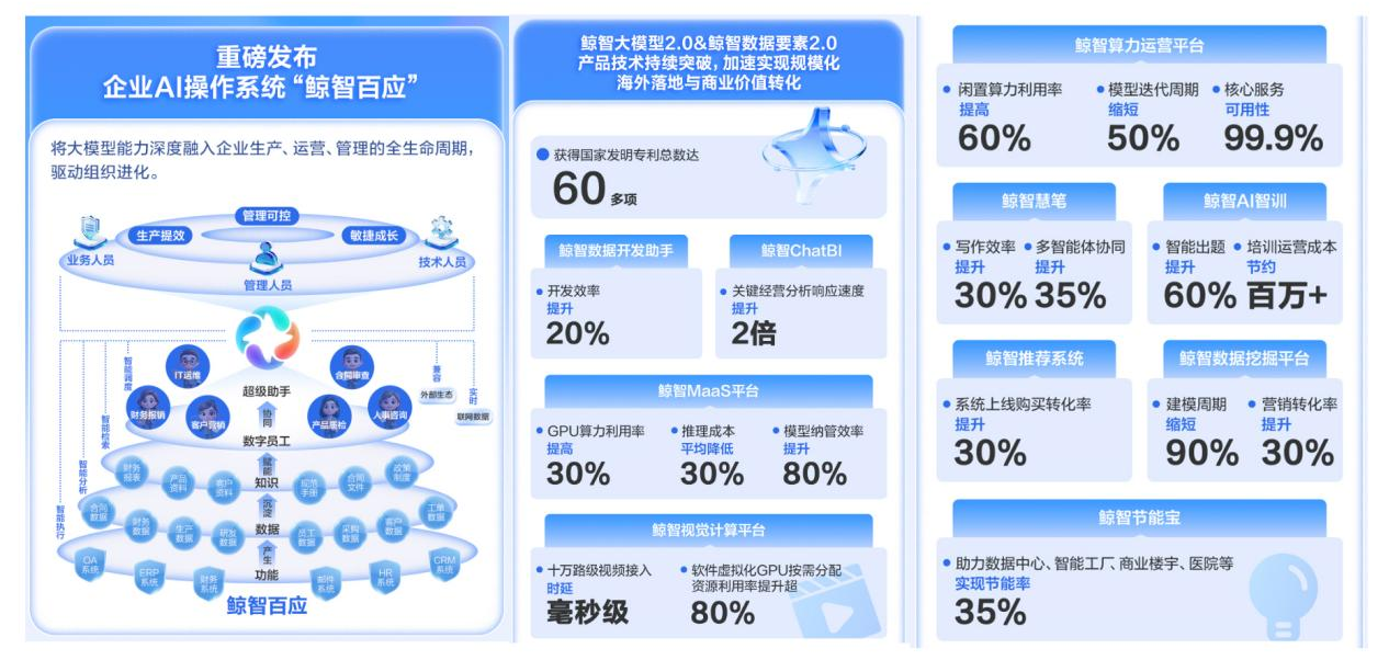 2025 年浩鲸科技重磅发布企业 AI 操作系统 “鲸智百应”,将大模型能力深度融入企业全生命周期运营。核心技术持续突破,升级发布鲸智大模型 2.0、鲸智数据要素 2.0 等数智技术体系,斩获 60 余项国家发明专利;核心产品关键指标显著优化,鲸智数据开发助手开发效率提升20%、鲸智MAAS平台GPU算力利用率提高 30%、推理成本平均降低 30%,视觉计算平台十万路级视频接入时延达到毫秒级,为逆势增长奠定坚实技术基础。