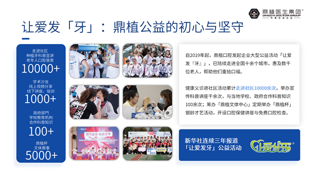 作为一家以“快”“乐”看牙为理念的口腔医疗品牌,鼎植口腔深耕行业多年,始终将“技术向善”作为发展的重要维度,积极参与公益慈善事业,以多种形式反馈社会。