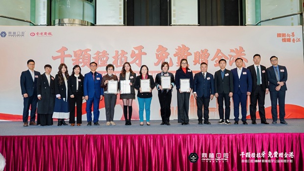 活动现场,鼎植医生集团董事长、总裁黎强先生与香港商报常务副社长、执行总编辑蓝岸先生分别向香港本地5家公益机构组织代表颁发捐赠证书,明确1000颗种植牙诊疗服务定向捐赠给符合条件的长者。