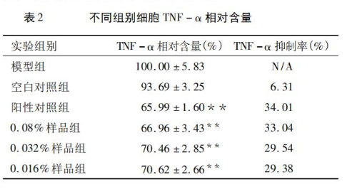 实验结果显示,在抗炎作用方面,显著降低了牙龈成纤维细胞中促炎因子TNF-α 的相对含量( 抑制率>29% ,P<0.05) ,与模型组相比差异显著。