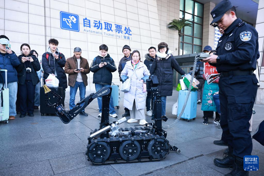 1月8日,在湖北省武汉市武昌站西广场,民警为旅客展示警用装备。新华社发(赵军摄)