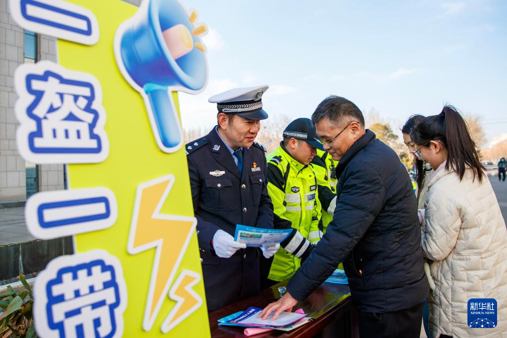 1月9日,在河南省商丘市睢县警民互动活动现场,睢县公安局交警大队民警为市民讲解道路交通安全的法律法规。新华社发(徐泽源摄)