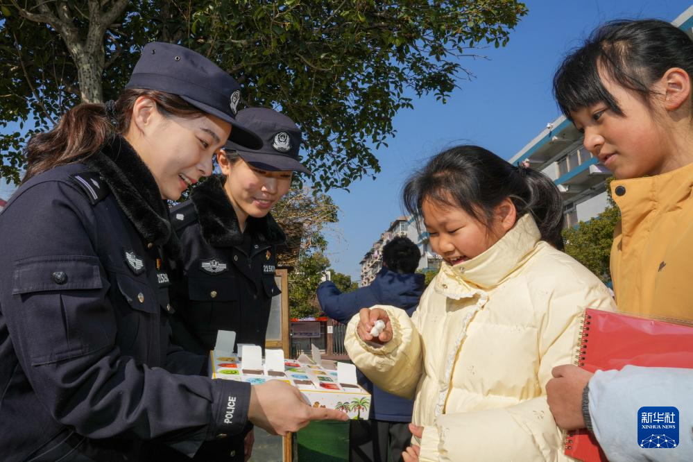 1月9日,南京市公安局建邺分局南湖派出所民警在辖区内一所学校进行“平安进校园”主题110宣传日活动。新华社记者 李博 摄