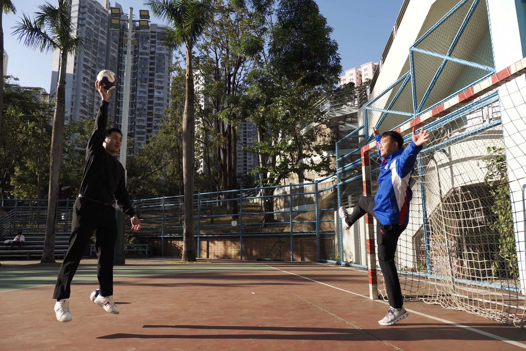 在香港新蒲岗彩虹道150号的露天游乐场,香港男子手球队主教练许文邦和队长谢永辉(左)在打手球(2025年12月17日摄)。新华社发(王申摄)