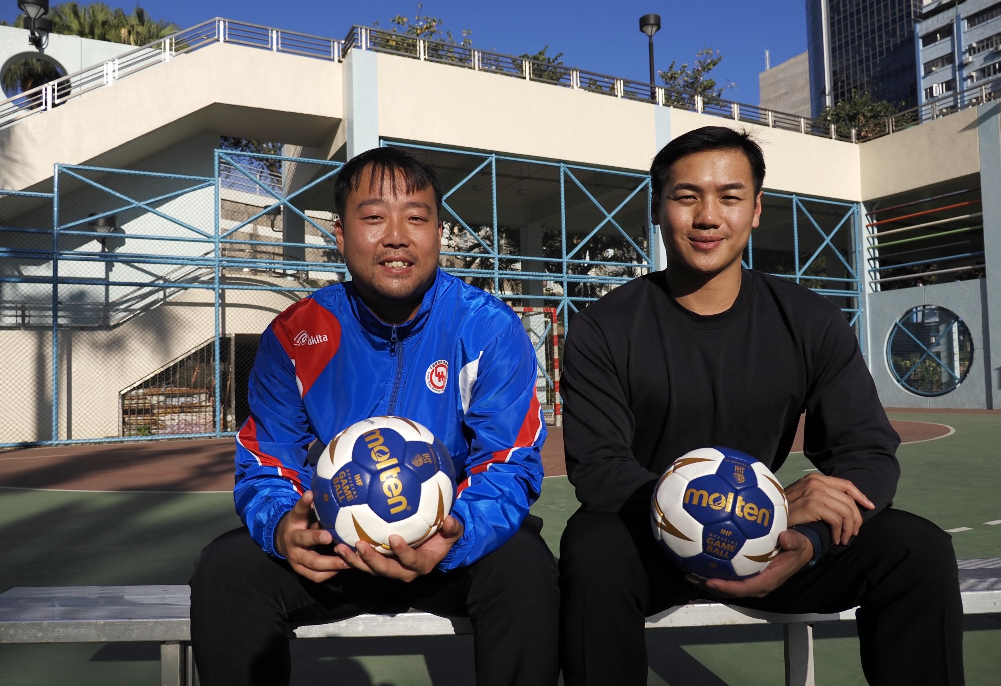 在香港新蒲岗彩虹道150号的露天游乐场,香港男子手球队主教练许文邦(左)和队长谢永辉一起接受记者拍照(2025年12月17日摄)。新华社发(王申摄)
