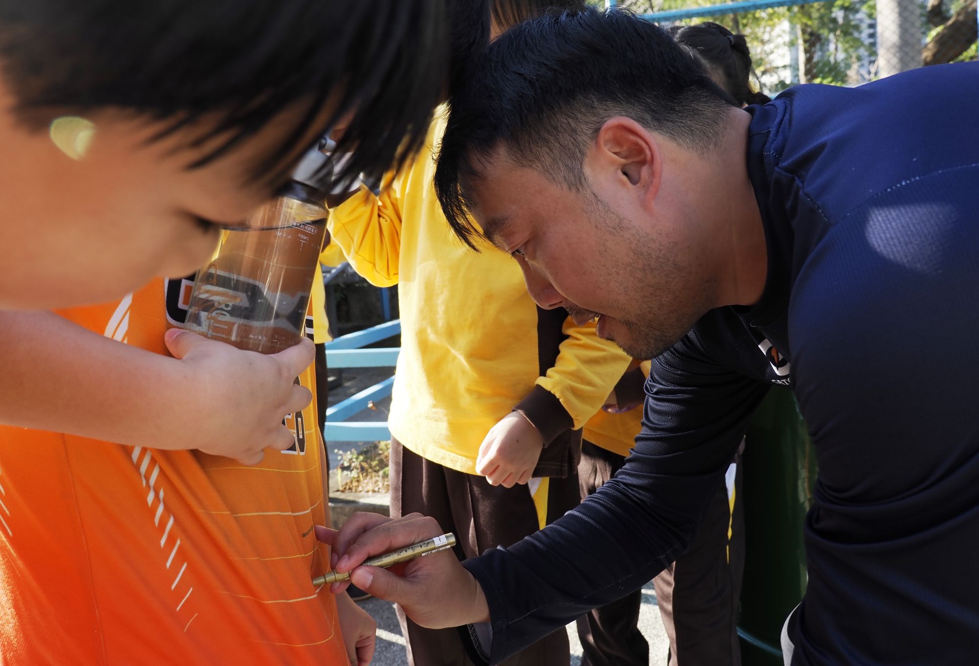 在香港新蒲岗彩虹道150号的露天游乐场,香港男子手球队主教练许文邦(右)在给小学生签名(2025年12月17日摄)。新华社发(王申摄)