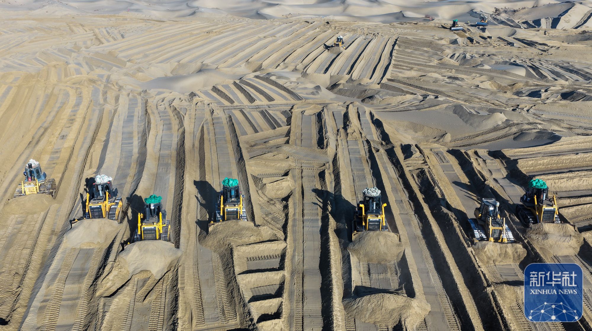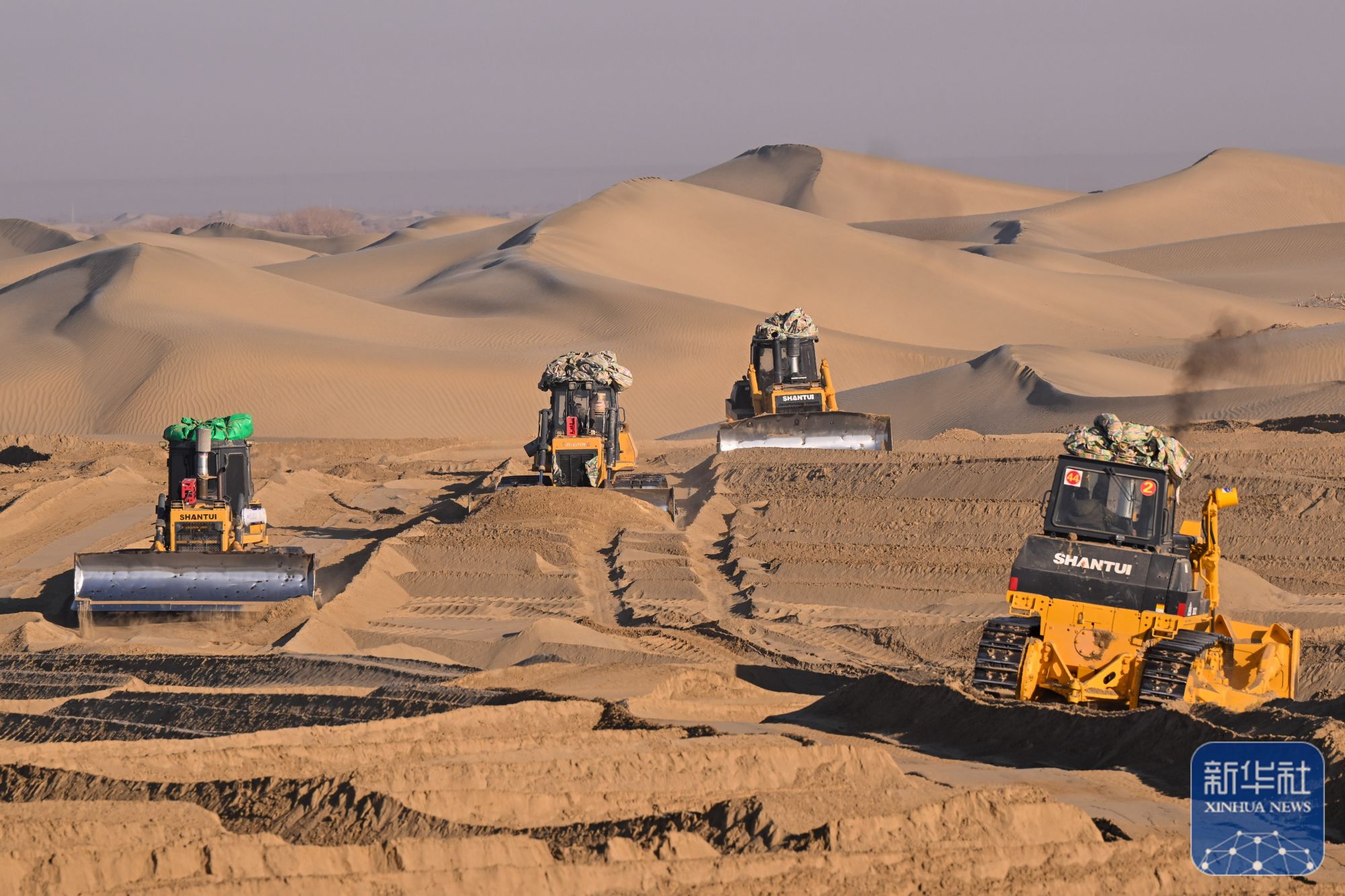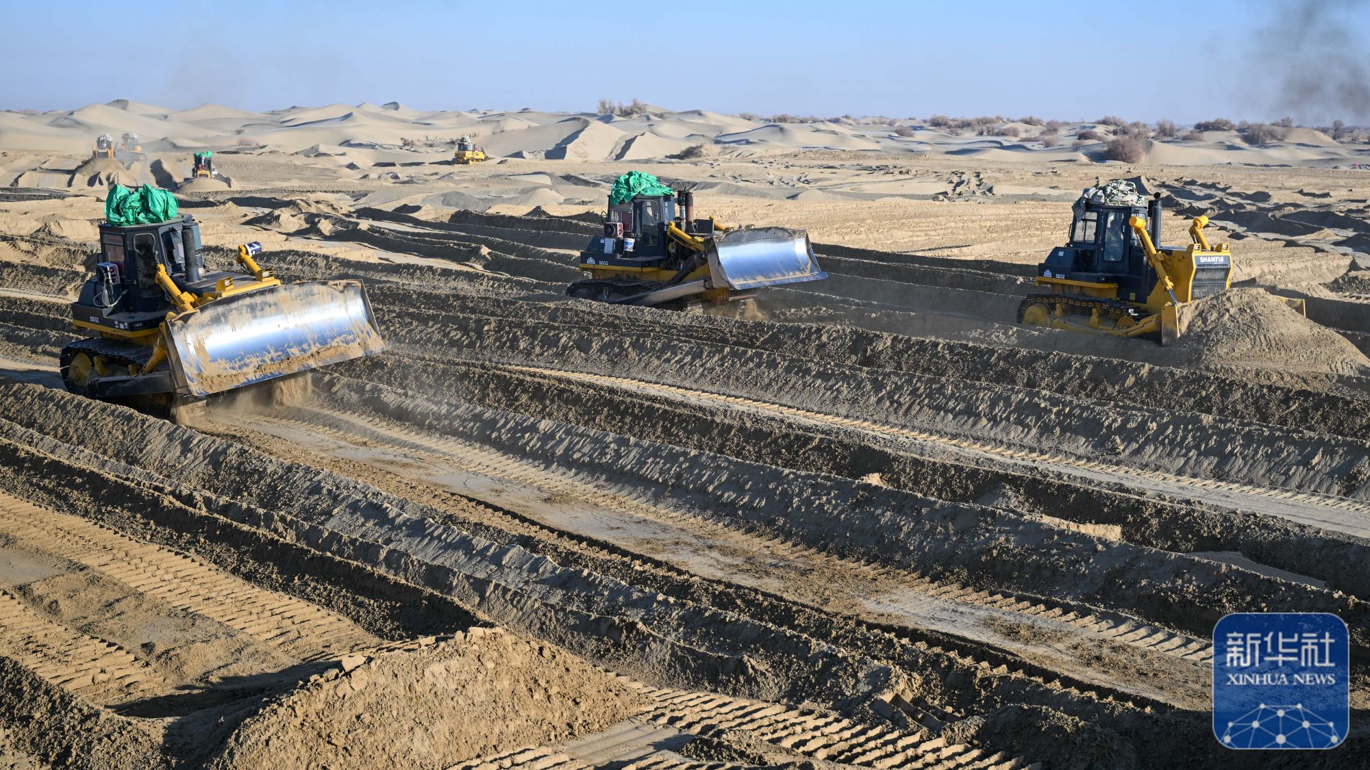 寒冬时节,尽管塔克拉玛干沙漠南缘的新疆和田地区墨玉县气温跌破零摄氏度,这里却涌动着治沙攻坚的热潮。数十台推土机轰鸣作业,推筑阻沙堤、平整沙丘,本地农户忙着收割加工芦苇、铺设草方格,冬季治沙工程高效推进。
