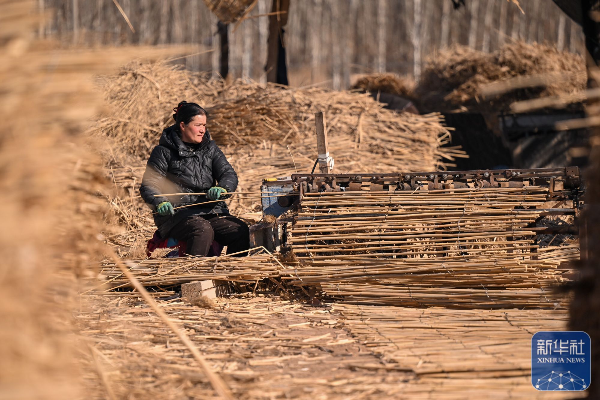 在新疆和田地区墨玉县碧玉农产品农民专业合作社,农户将收割的芦苇压制成捆(1月10日摄)。
