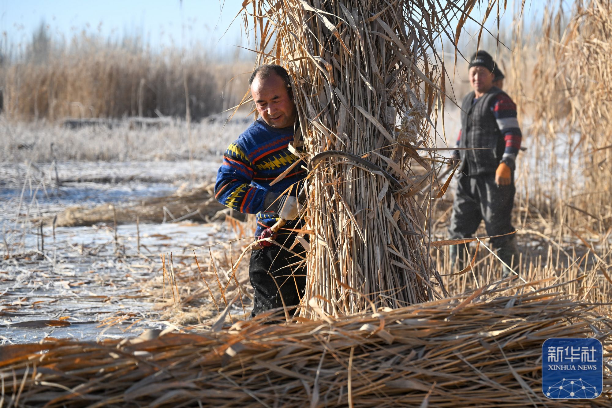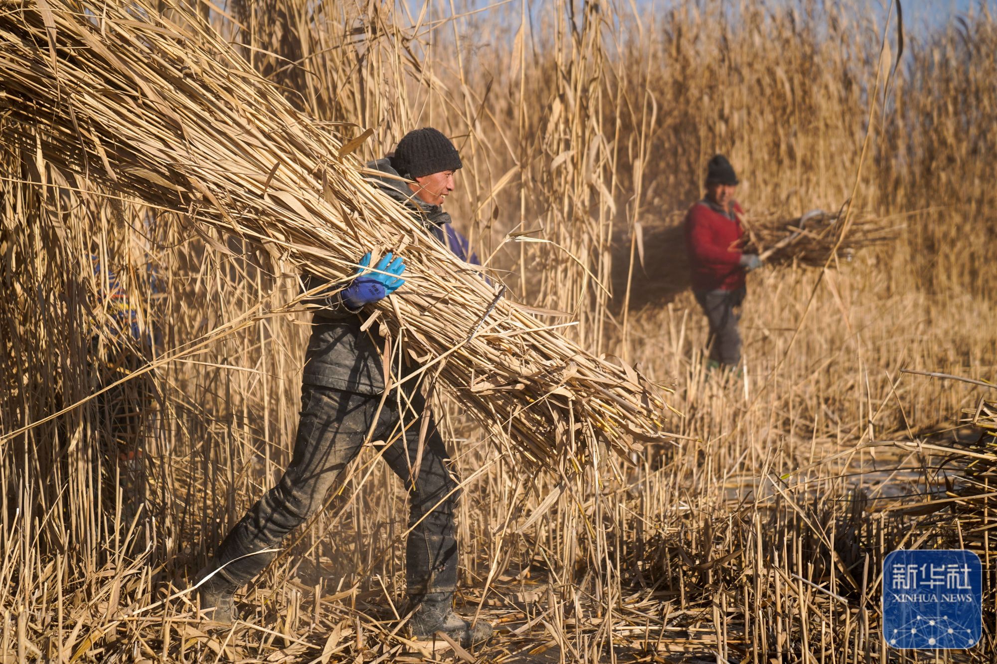 在新疆和田地区墨玉县扎瓦镇,当地农民在收割芦苇(1月10日摄)。