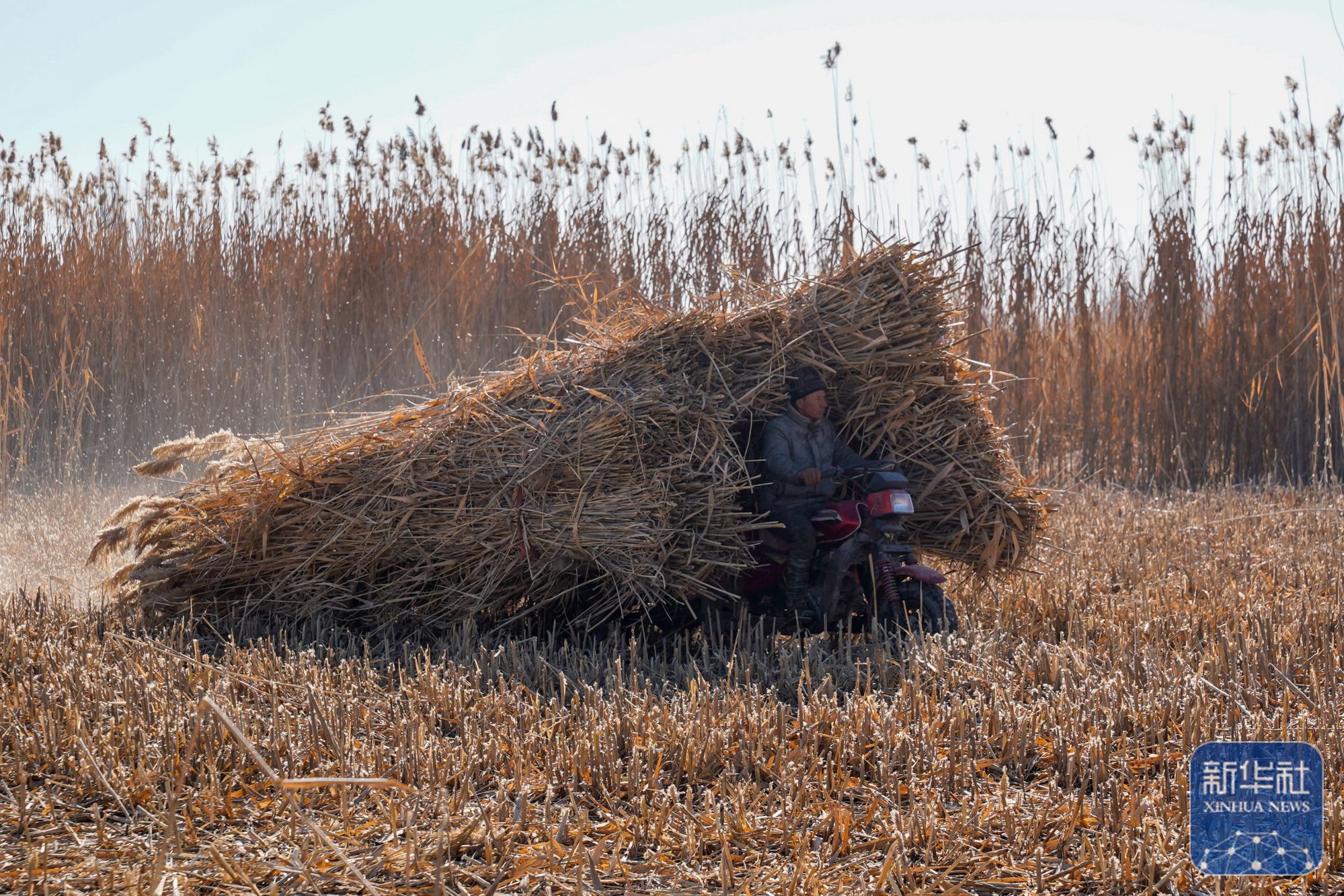 在新疆和田地区墨玉县扎瓦镇,当地农民运送收割的芦苇(1月10日摄)。