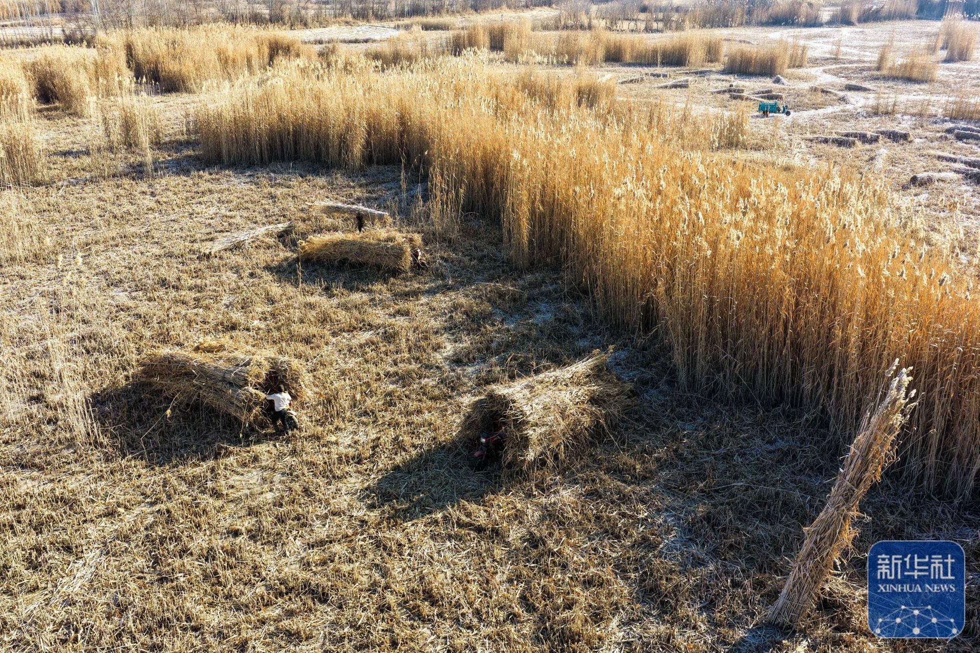 在新疆和田地区墨玉县扎瓦镇,当地农民在收割芦苇(1月10日摄,无人机照片)。