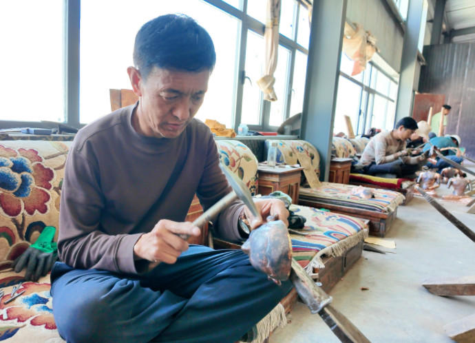 如今,加工厂带动6名脱贫群众、1名残疾人就业,月工资五六千元,五年分红54.86万元,今年还为定日地震灾区捐款3万元。从酥油灯、糌粑桶到配饰、摆件,孜东铜器变的是创意,不变的是匠心。锤起锤落间,薪火代代传。