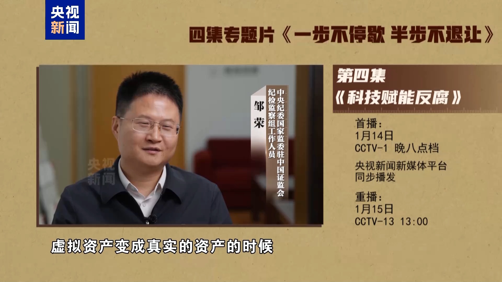 电视专题片《一步不停歇 半步不退让》第四集《科技赋能反腐》,讲述纪检监察机关丰富防治新型腐败和隐性腐败有效办法,以信息化赋能正风反腐,充分运用科技手段精准发现不正之风和腐败问题线索、迅速有效突破案件,着力提升智慧反腐、科技反腐水平。总台央视综合频道1月14日晚8点档播出,央视新闻新媒体平台同步播发。