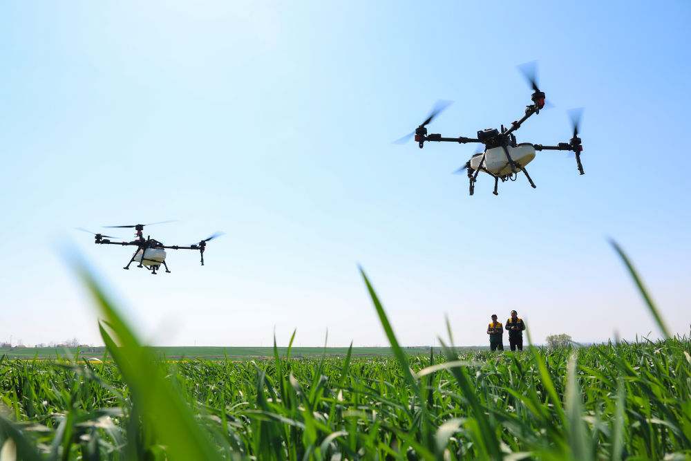 2025年3月20日,在湖北省枣阳市七方镇大房村麦田里,枣阳市顺辉农机专业合作社技术人员操作无人机进行植保作业。新华社发(杨东摄)