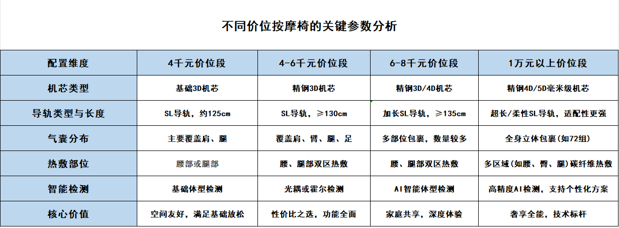 市场调研数据显示,2026年中国按摩椅市场规模预计将突破250亿元,家庭渗透率稳步提升。曾经被视为奢侈品的按摩椅,正快步走入寻常百姓家。如今,不论是都市还是乡村,日常按摩成为户户重视、人人研究的养生学问。按摩椅也顺其自然成为大家考虑的康养按摩硬件单品。当我们准备买一台按摩椅时,面对4千元到1万元,甚至更宽的价格区间,大家首先的困惑通常是:不同的预算、不同价位段的按摩椅怎么选购?这篇文章小编会根据配置的差异和不同的需求,为您分析和推荐不同预算和不同价位段的按摩椅。