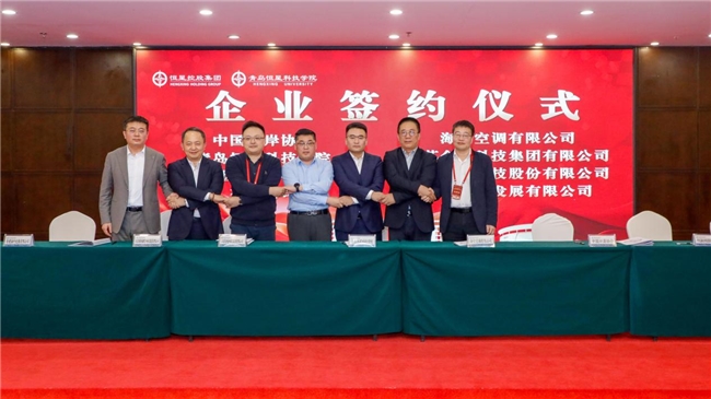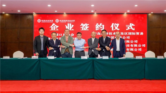 润泽园教育党支部书记、青岛恒星科技学院国际关系学院副院长 郭红波(上图左二/左一)与多家企业代表签约